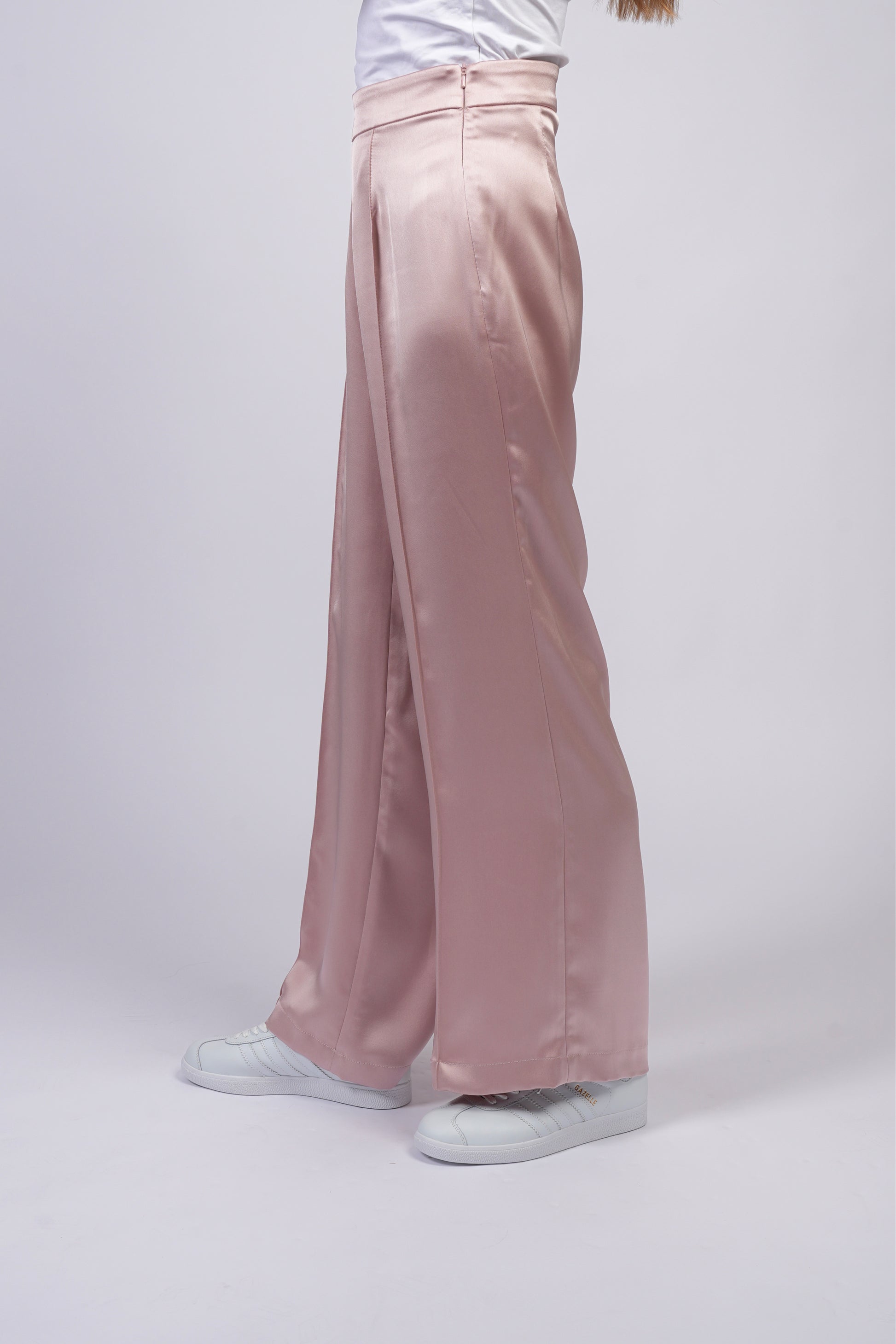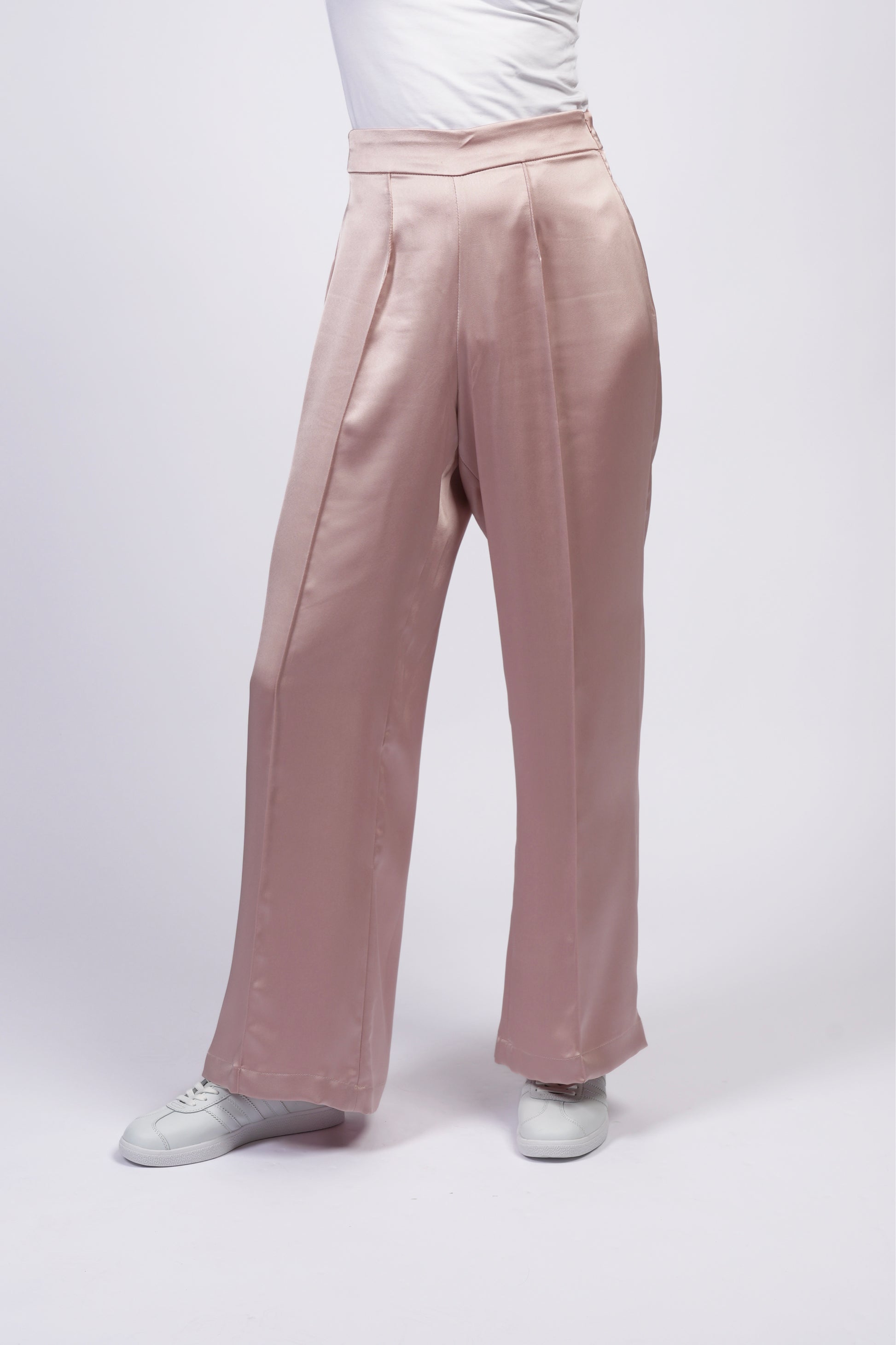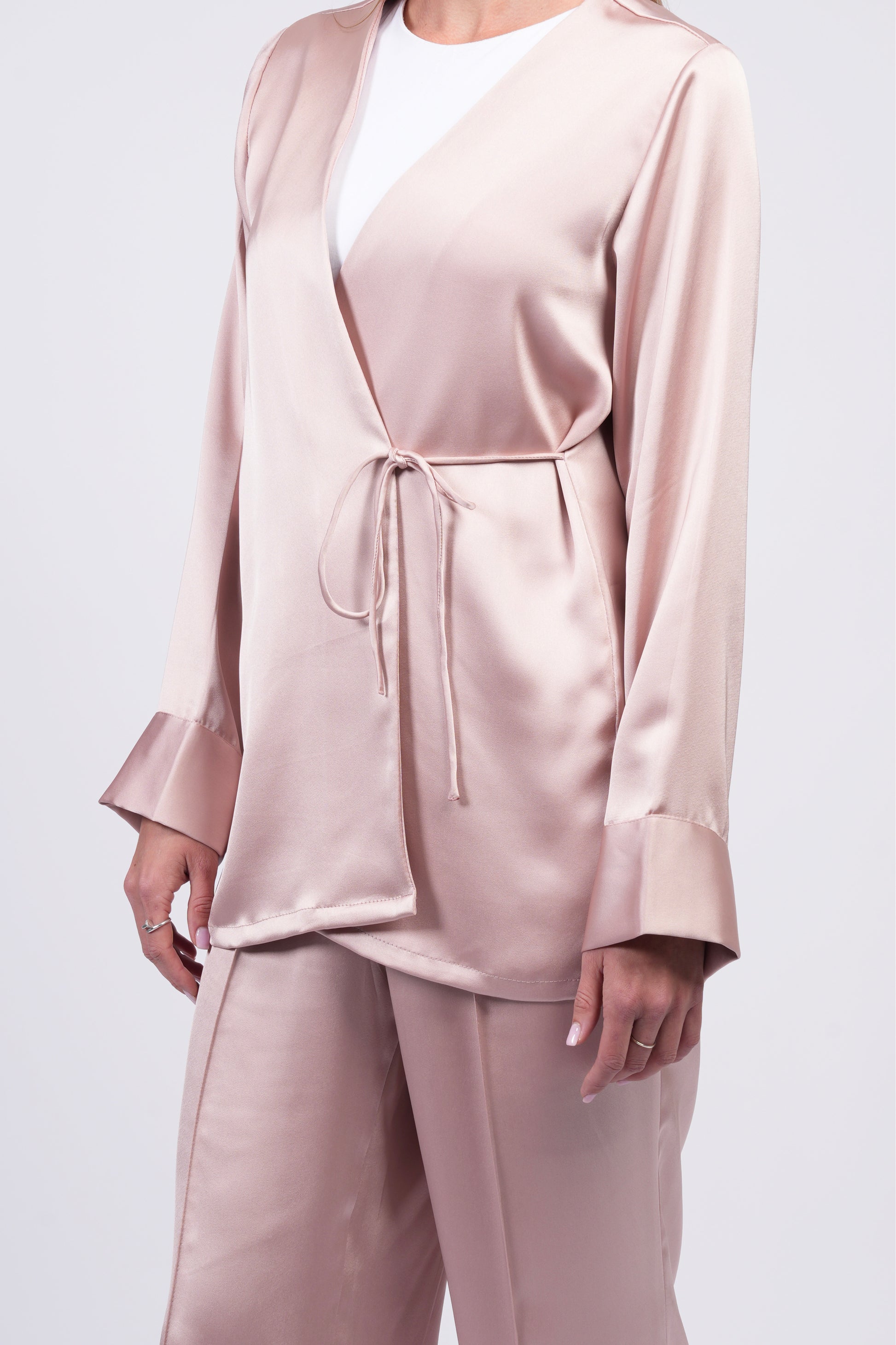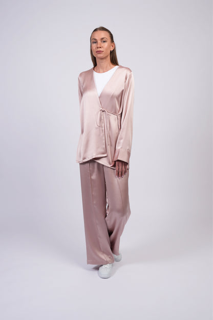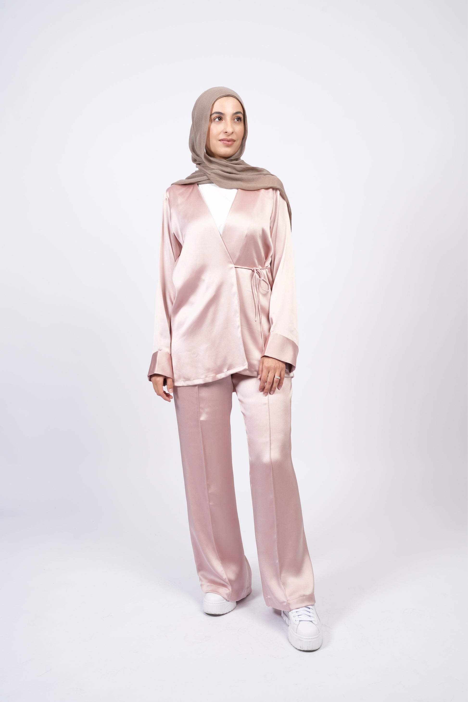 This set features a wrap-style satin top with an elegant V-neckline to create dimension which you can layer over a modest inner panel for full coverage. A delicate side tie cinches the waist for a customizable fit, while wide cuffed sleeves add a polished finish. Paired with relaxed wide-leg satin pants and a comfortable waist band.